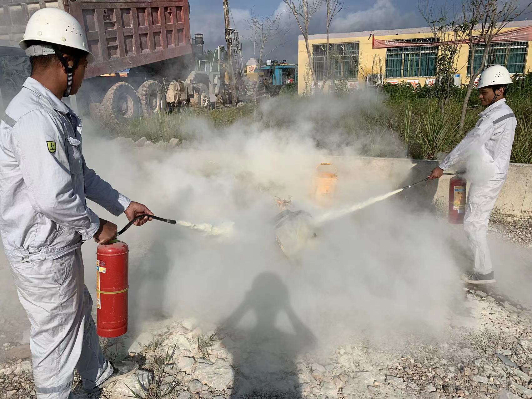 安全宣講階段:礦山安全員對(duì)此次消防演練的目的及消防演練的重要性進(jìn)行了傳達(dá)貫徹,并向員工說(shuō)明了滅火器的正確使用方法、滅火器的種類(lèi)和滅火類(lèi)型,滅火注意事項(xiàng),并就如何使用滅火器補(bǔ)救初期火災(zāi)等進(jìn)行了現(xiàn)場(chǎng)示范。